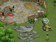 This requires bees, an adult builder, and a child for distraction. Above and to the right of the enclosure is a Noni bush. There is a Hungry Totem in front of it. In order to get food from the bush, you must get the guards away and tear down the totem. Use the bee power on the bush. This will increase the number of Noni berries and temporarily drive away the Red Mask Heathen. Once the heathens near the bush run awaym use a child to distract any orange masks in the area. Then, drop your adults on the totem to tear it down. Keep the orange guards away and keep your adults on it until the totem collapses. This will happen fairly quickly. Once the totem is gone, the red mask and the orange mask will go elsewhere. You can now harvest food.